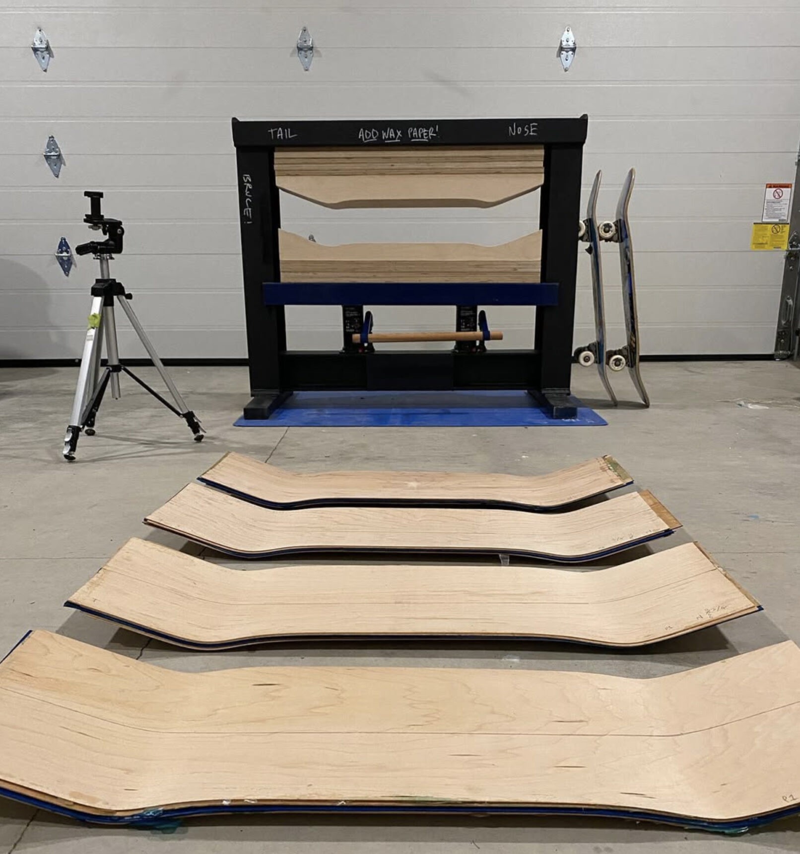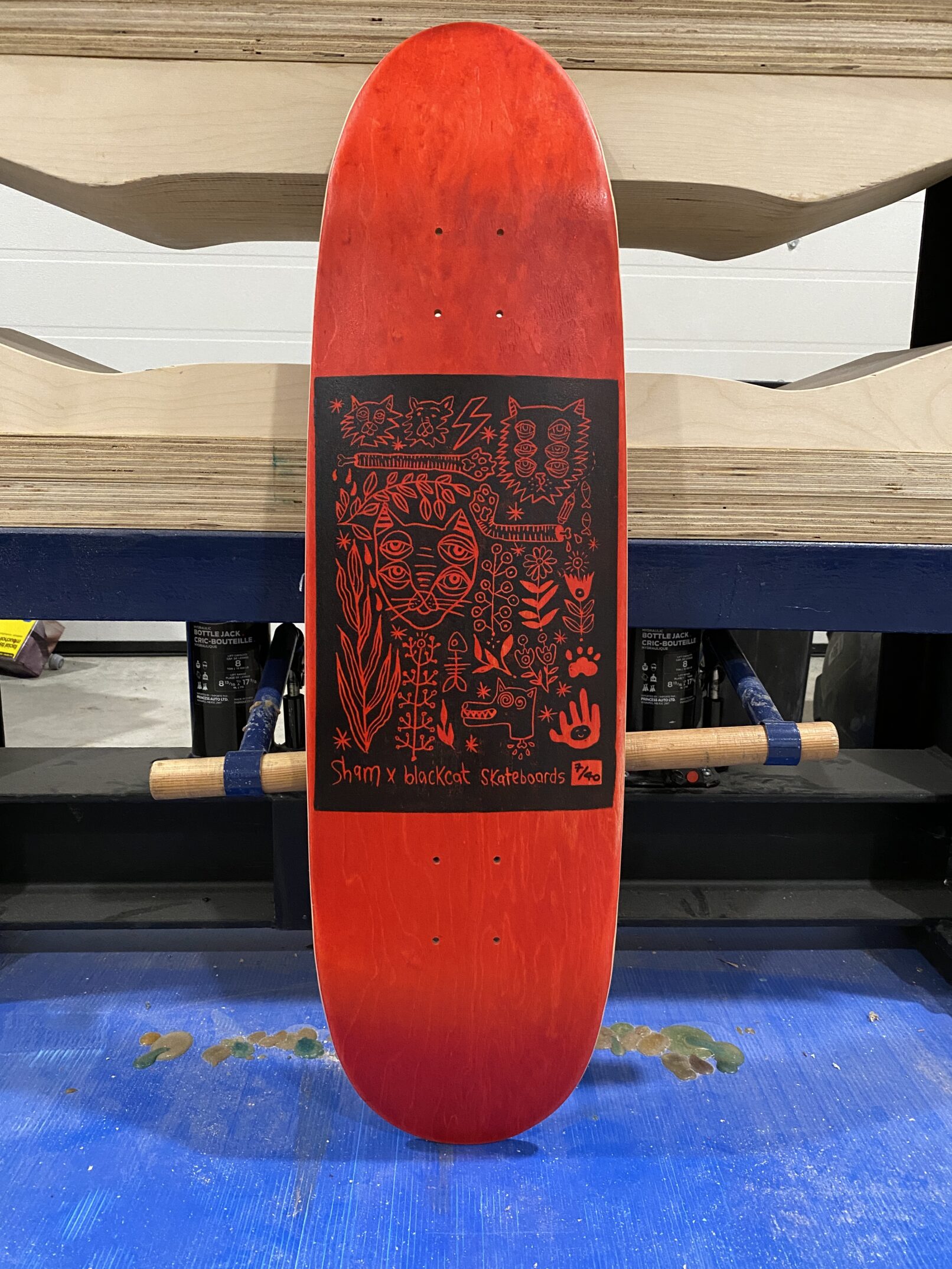 Black Cat Skateboard Press is a passion project of my own. In 2003 I built a basic press in the garage of my family home and pressed a snowboard, the snowboard was rideable but it had many flaws. I wanted to continue on with this creative outlet in a simple way. Working with wood and glue to make skateboards seemed like a way of achieving this without using such difficult materials. Moving forward to around 2020 i designed this steel skateboard press that would allow for 20+ tons of pressure to be applied to a skateboard mold.. in 2022 the press was welded together and the BlackCat skateboard press was born.